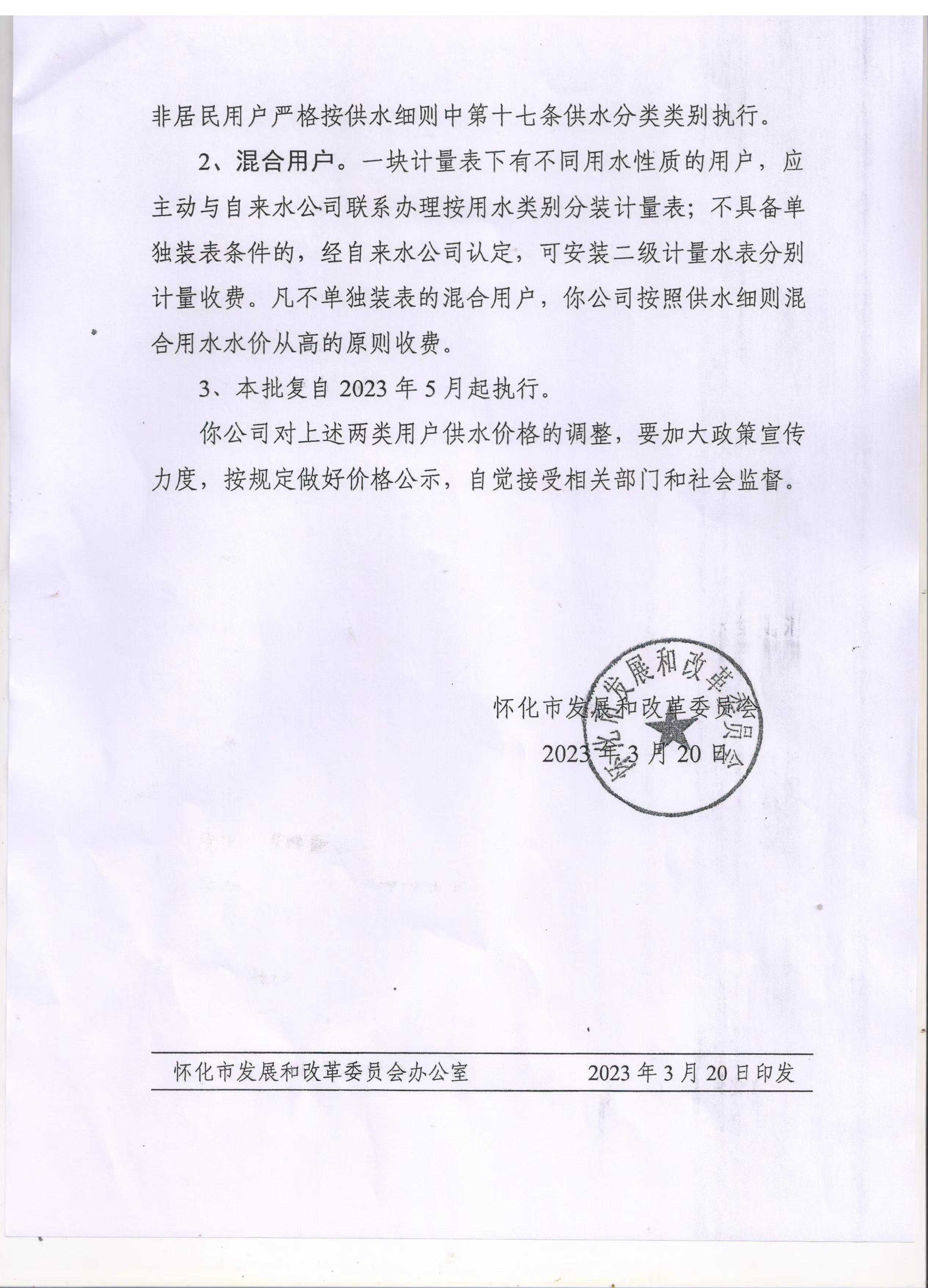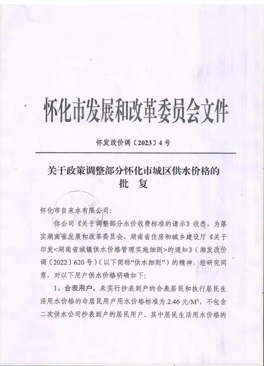 懷化市自來水有限公司—關(guān)于政策調(diào)整部分懷化市城區(qū)供水價格的批復(fù)